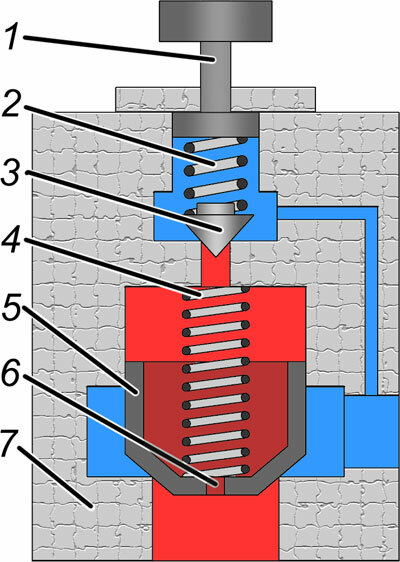 Настройка клапана осуществляется регулировочным винтом 1, который позволяет изменить предварительное поджатие силовой пружины 2.