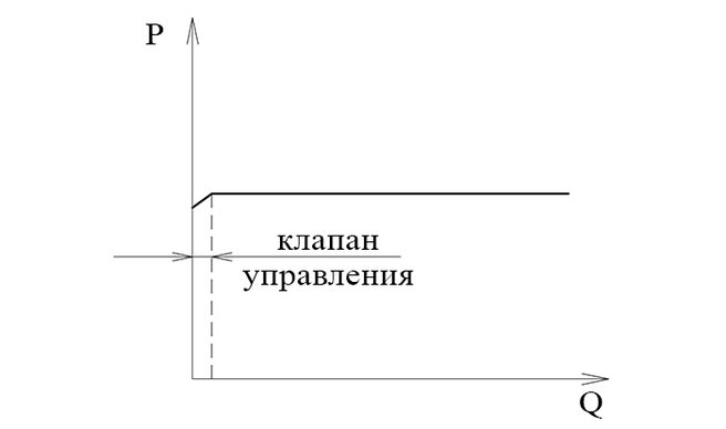 Клапан управления представляет собой классический предохранительный клапан прямого действия. Этот клапан способен пропустить лишь небольшой расход. Однако при его открытии за счет возникшего перепада давления на постоянном дросселе 6 запорно-регулирующий элемент 5 переместится вверх соединив напорную линию со сливом.